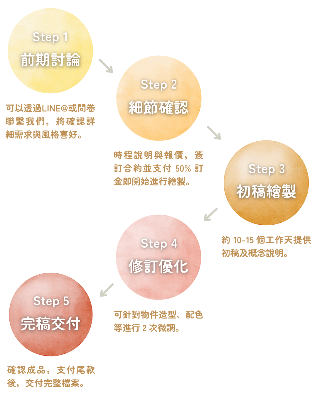 我們會在 10–15 個工作天內提供初稿確認,如果所有的工醬都在趕稿中,我們會先提醒排隊順序,保證不會讓你苦苦等候